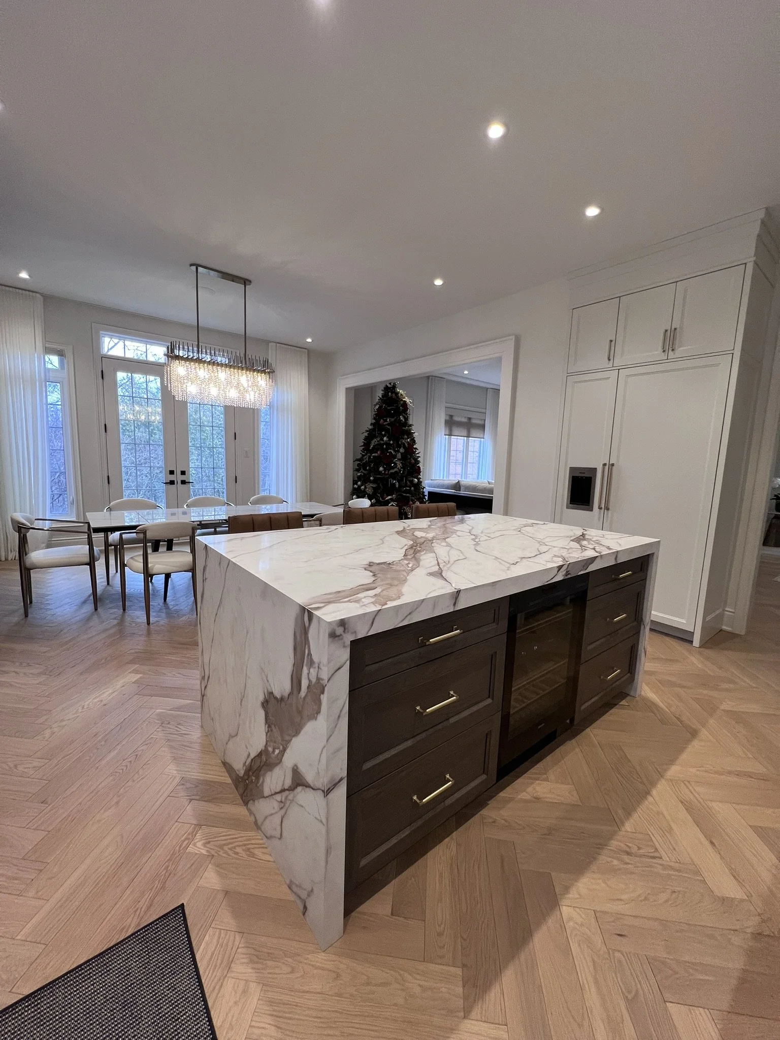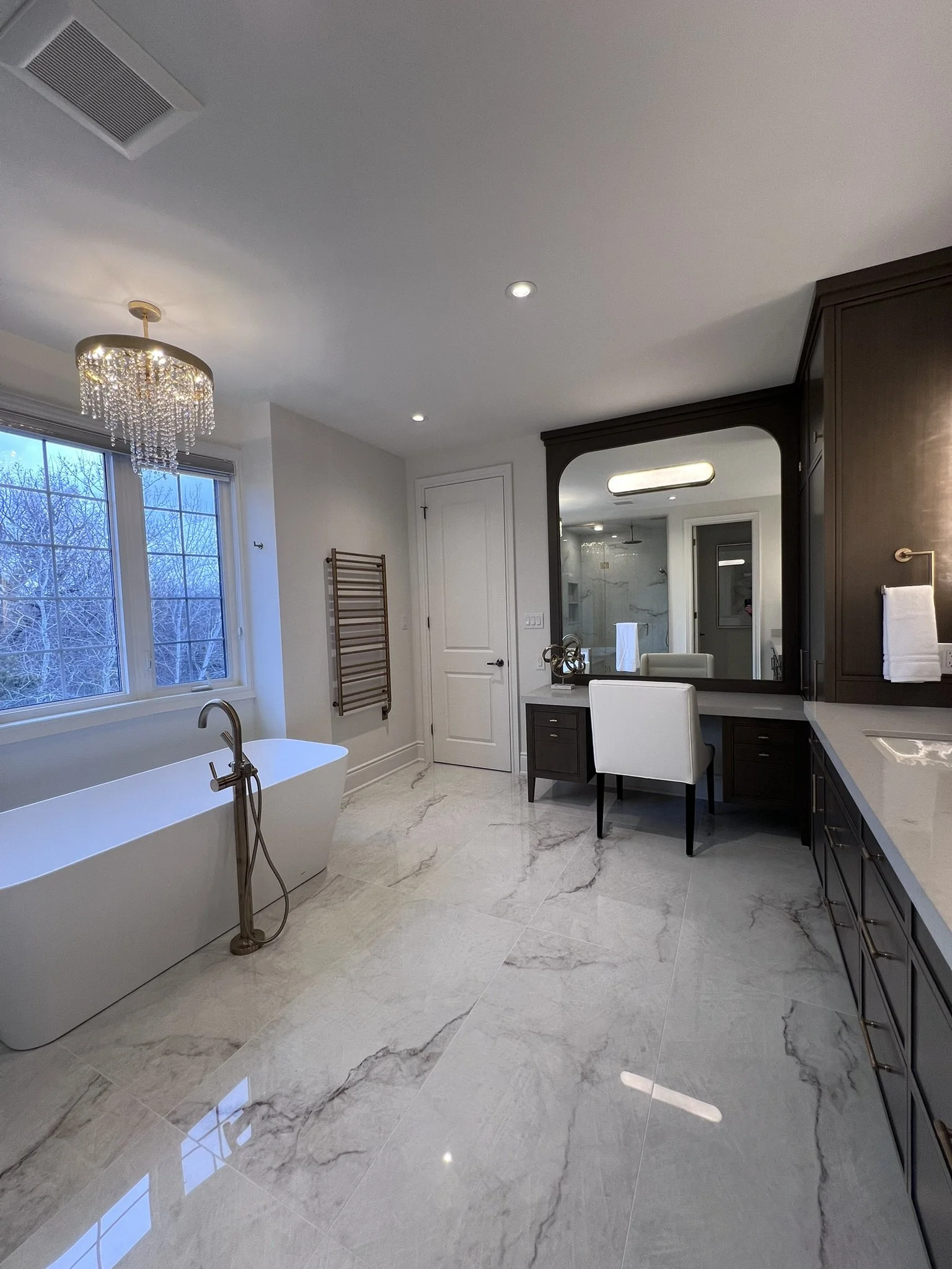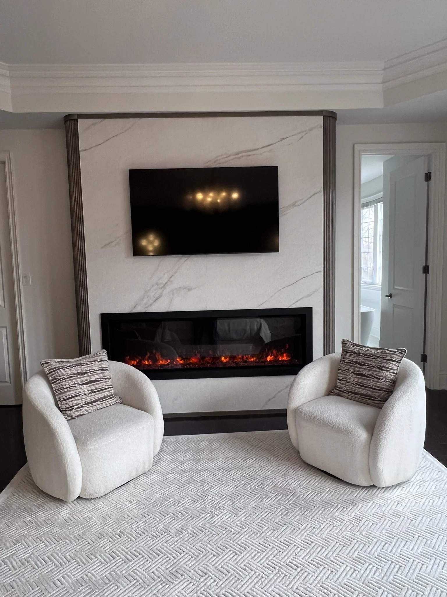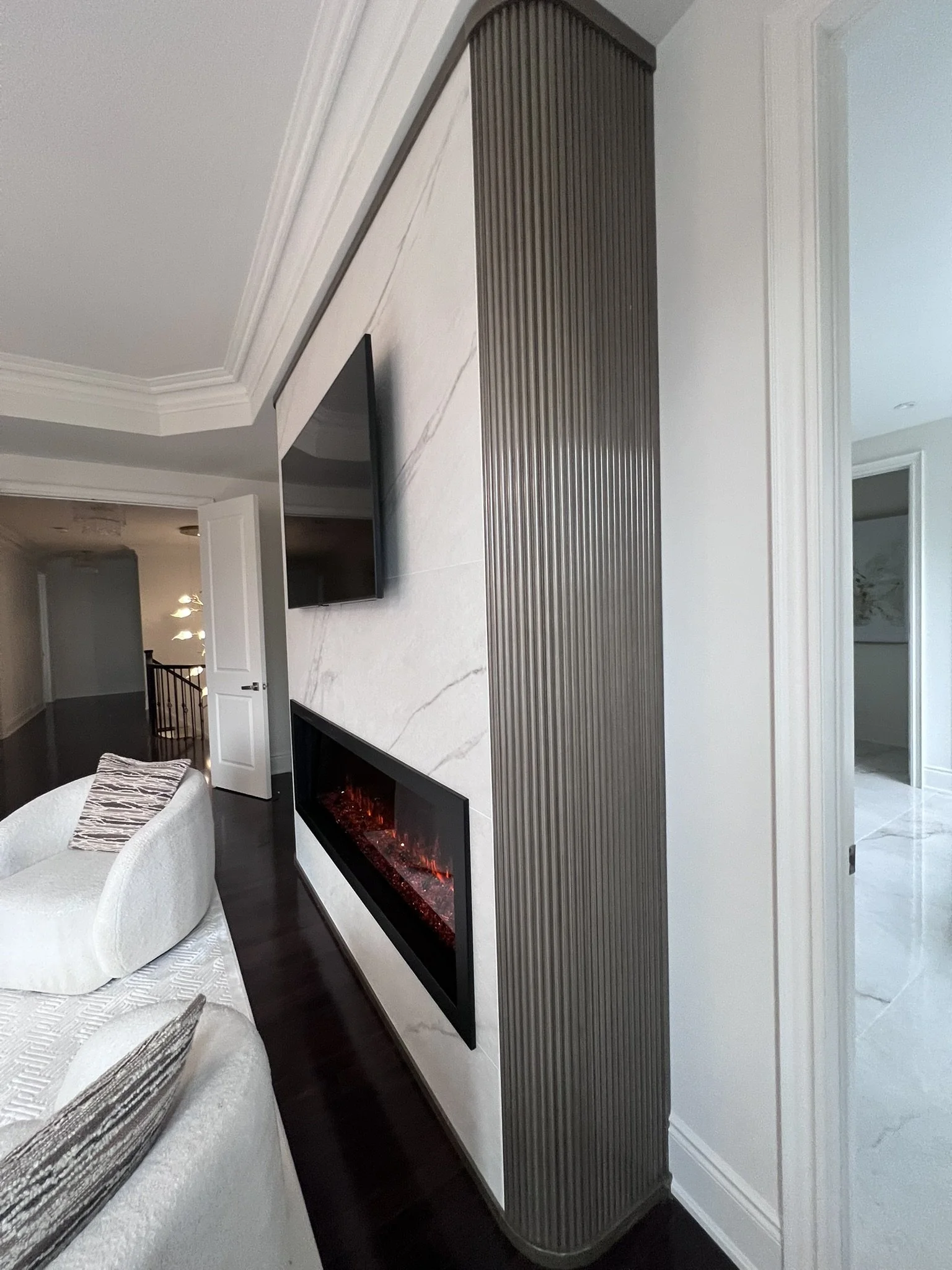 The main floor renovation included a custom kitchen renovation, powder room upgrade, fireplace installation, and new flooring throughout. On the second floor, the primary ensuite and children’s bathroom were completely redesigned, creating a functional and modern family living space.